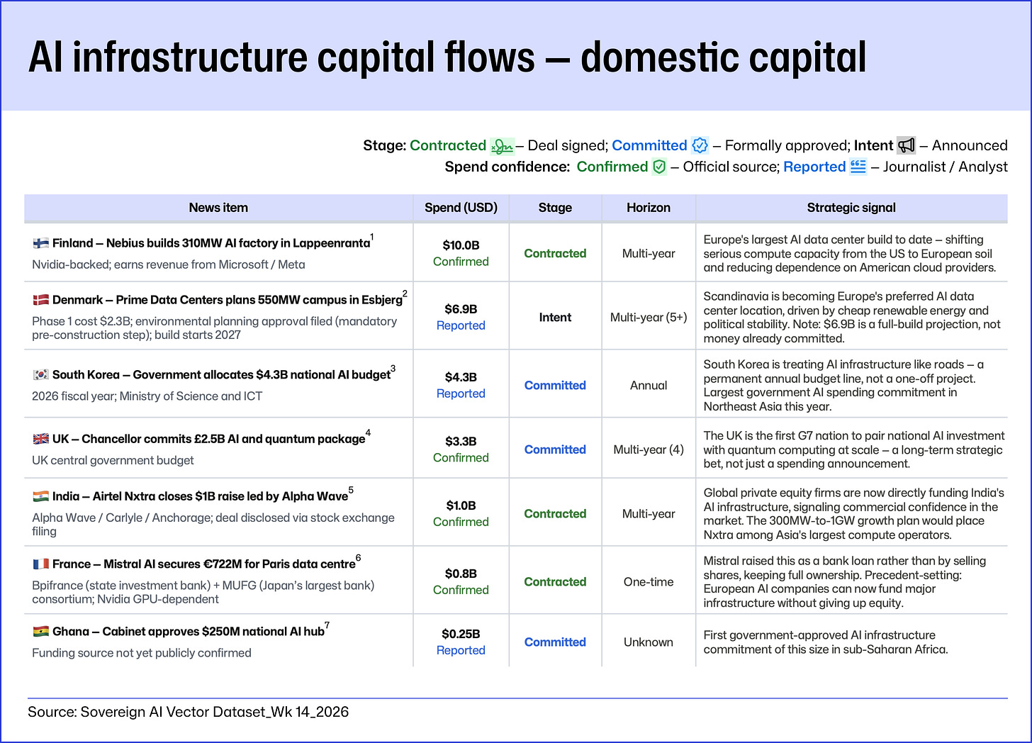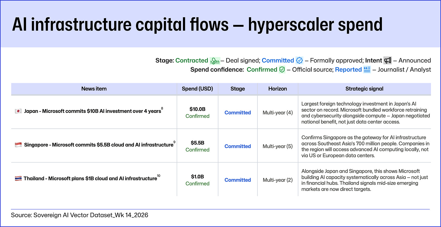 The domestic side shows AI infrastructure being financed through locally anchored capital, national initiatives, and regional platforms. That matters because it points to a market in which AI capacity is being treated less as a downstream technology purchase and more as strategic infrastructure shaped closer to home.