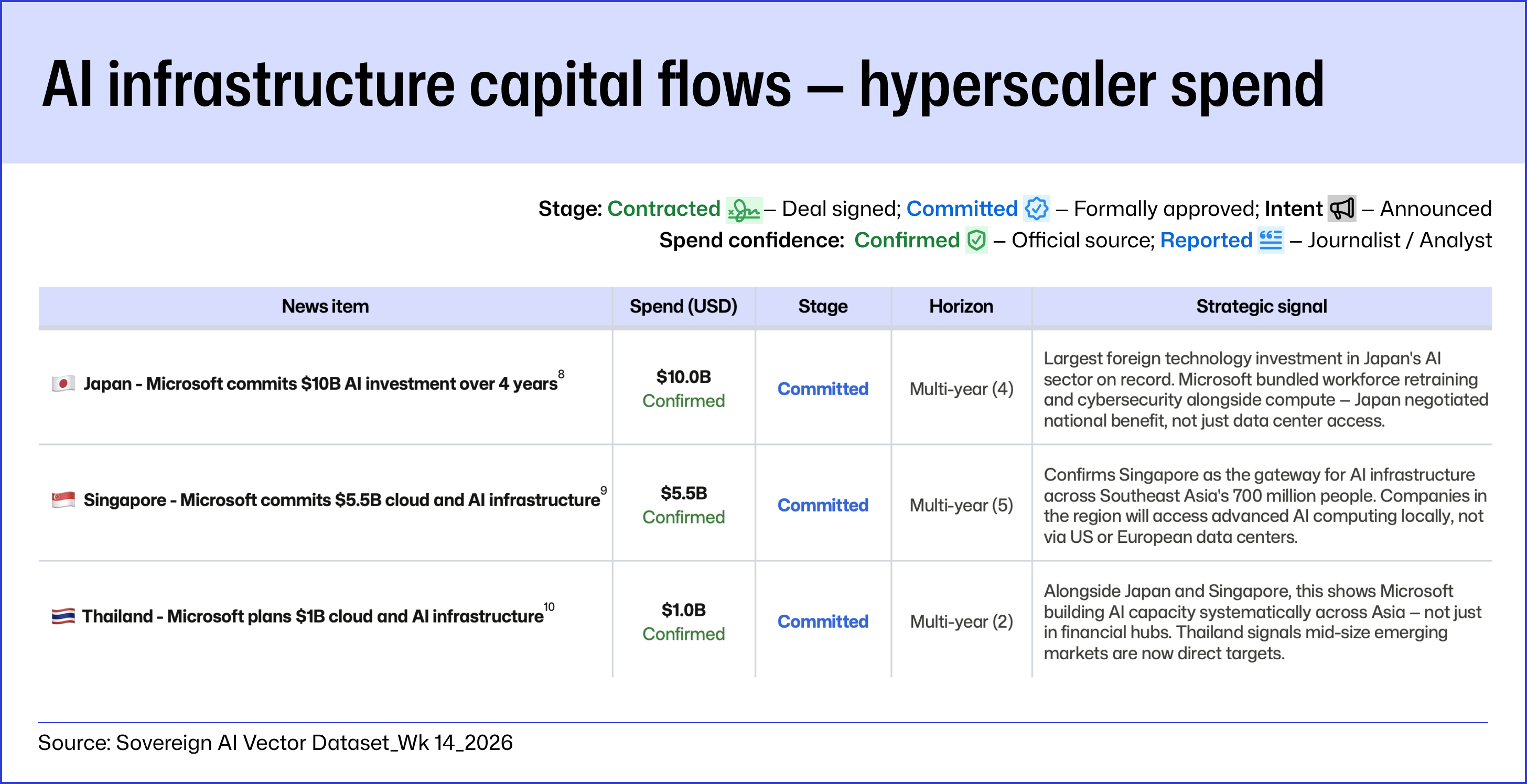 About this brief: We use a human-led, AI-assisted research and verification process. Spend figures are sourced to primary documents, official announcements, or named press reports — confidence level noted per item. All figures represent total commitments, not annualized amounts. Cited sources are listed below.