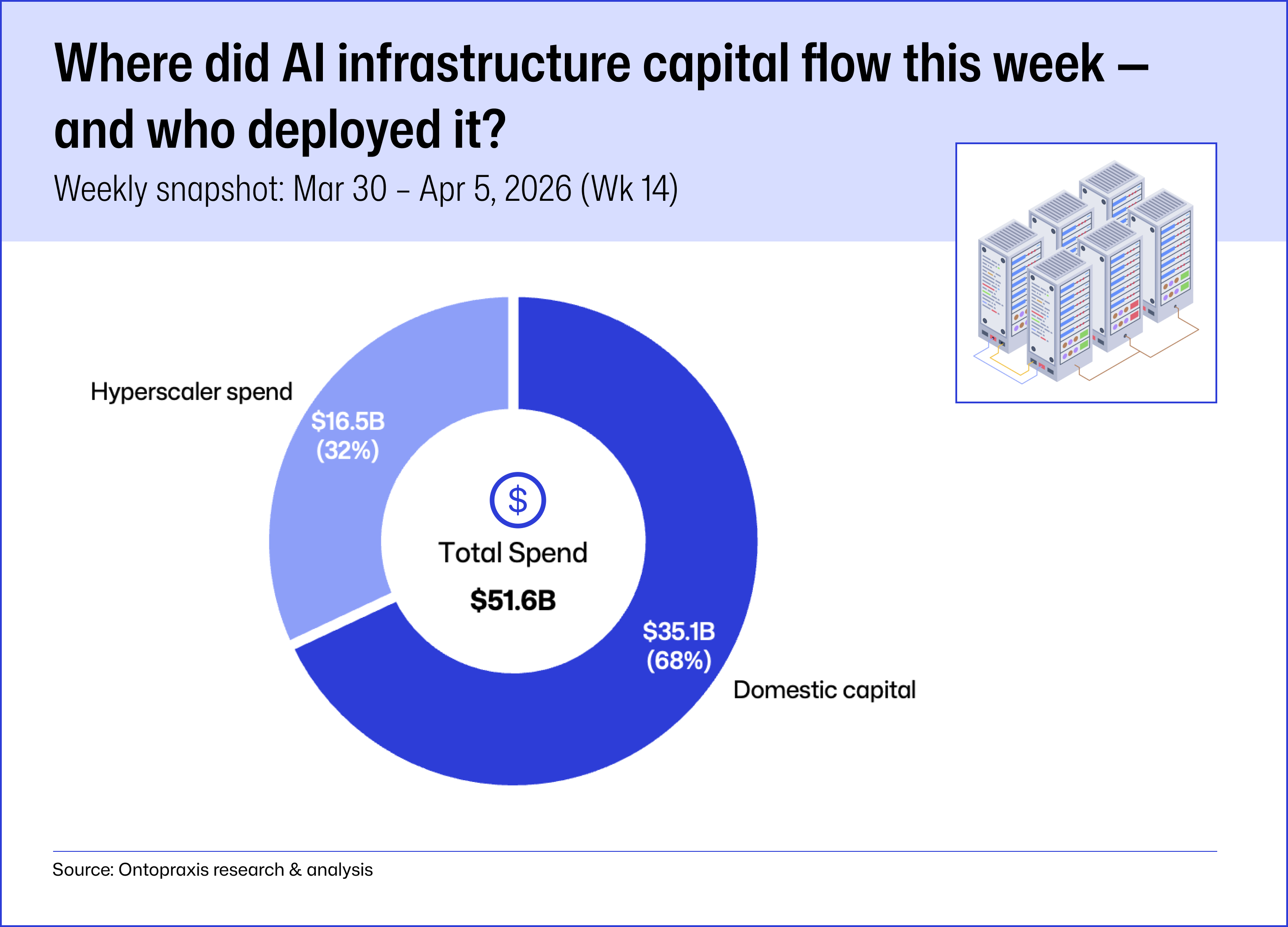 This week's snapshot suggests that AI infrastructure investment is being shaped by more than just hyperscaler capex. Of the $51.6B tracked here, $35.1B (68%) sits in the domestic capital bucket, while $16.5B (32%) comes from hyperscaler spend. The more useful reading is not a hard divide between the two, but a broader one: the capital base behind AI infrastructure is widening.